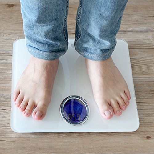 -. Feature : Smart Design - Besteht aus hochwertigem bruchfestem Hartglas, welches 4-mal stärker ist als herkömmliches Glas. In dem Glas sind Sensoren die fortschrittliche Algorithmen nutzen, um sofort das Körpergewicht, Körperwasser, Körperfett, BMI, BMR, Muskelmasse, Knochenmasse und Viszeralfett zu berechnen. / Begleitete Anwendung - Laden Sie die zugehörigen "iWellness" App herunter und verbinden Sie es drahtlos mit Ihrer Waage zur Überwachung der Körpermaße. Speichert und zeigt alle Messwerte für bis zu 10 verschiedene Benutzer in einfach zu lesenden Diagrammen. Unterstützt Bluetooth 4.0, Android 4.3 und iOS 6.1 oder höher. / Bequemlichkeit - Verwendet 4 hochpräzise Sensoren für Messungen bis 180 kg in 0.2 lbs/0.1 kg Schritten. Blaue Sapphir LCD Anzeige ist einfach zu lesen mit intelligenter Step-On Technologie, so dass die Waage beim Wiegen automatisch eingeschaltet wird. / Schnelle Einstellung - Setzen Sie die mitgelieferten 4 * AA-Batterien ein und wählen Sie kg oder lbs. Die Waage wird für die Messung des Körpergewichts breit sein. Verbinden Sie den "iWellness" App drahtlos um eine weitere Auswahl an anderen Körperdaten zu verfolgen und alle Messwerte speichern. / Achtung: Halten Sie die Waage trocken. Die Waage wird sich automatisch nach 30 Sekunden oder bei Überlastung abschalten. Ziehen Sie Ihre Schuhe und Socken aus, um genaue Messwerte zu gewährleisten. Mobile-App ist erforderlich für die Berechnung und Verfolgung Körper Indizes außer Körpergewicht.