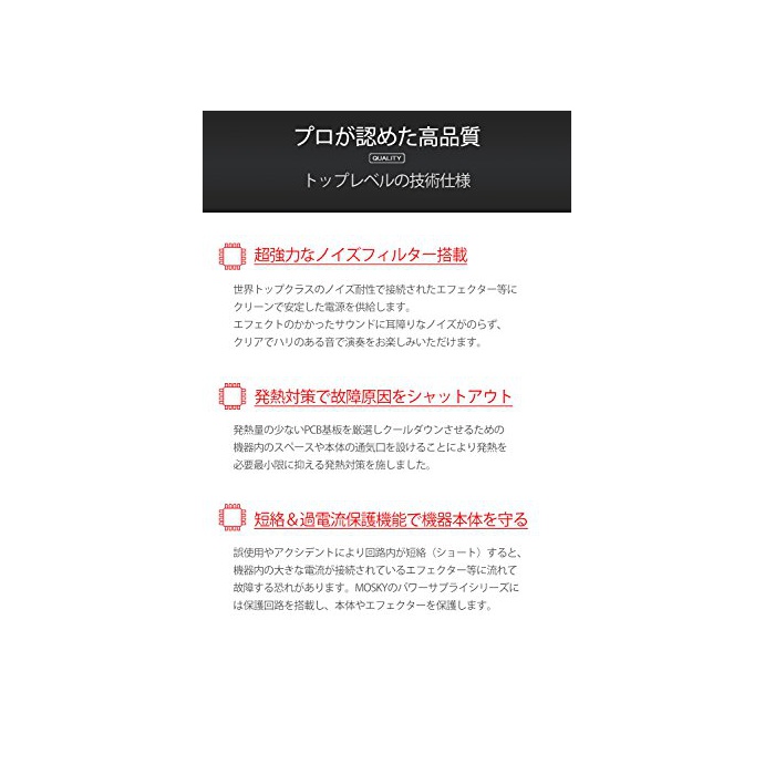 [특징] MOSKY는 유럽의 일류 아티스트가 라이브로 사용하는 독립형 파워 써플라이입니다.9,12,18V의 전원을 안정되어 공급합니다.
