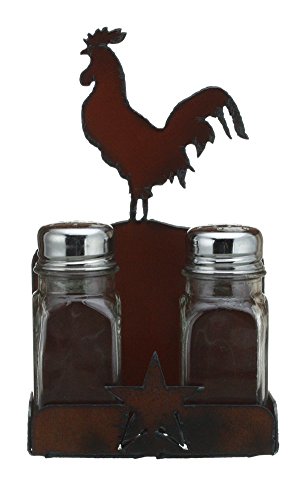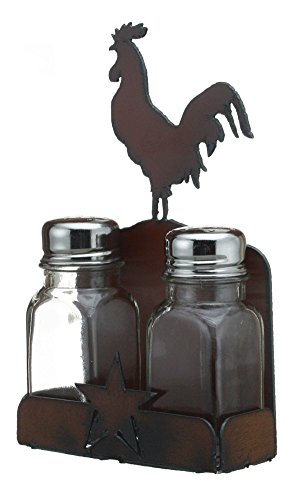 Rustic Ironwerks Salt and Pepper Shaker Set and Holder- Rooster - 4.5" By 7.5" By 2"