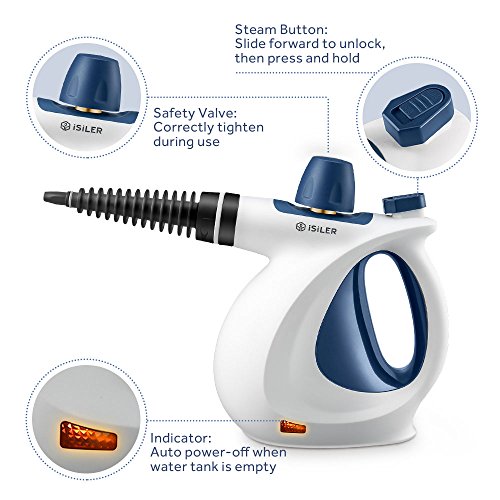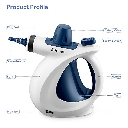 iSiLER Handheld Steam Cleaner uses the power of steam to clean and sanitize your home, car and more without using any harsh chemicals. Create that healthy and hygienic living environment your family needs with iSiLER. This multifunctional cleaner comes with a safety lock so your children and pets won't get hurt accidentally, and provides 7 minutes of continuous steam. You can even use the steamer as a clothes iron to remove any wrinkles from your favorite garments. The steam cleaner makes a practical gift to help with household chores. Specifications: Input: 110-120 V 60 Hz Power: 900-1050 W Water tank capacity: 11.8 oz/350 ml Continuous steam time: 7 minutes Steam flow: 1 oz per minute/28 g per minute Pressure: 2.8 bar Cord length: 2 m/6.6 ft Size: 11.2" x 5.7" x 8.9 "/28.5 cm x 14.5 cm x 22.5 cm Weight: 38.3 oz/1.1 kg Waterproof rating: IPX4 Fast Guide 1. Assemble a desired attachment if needed, fill the tank with water and connect the device to the power socket, allowing it to heat. 2. Gently press the steam button to check if there is steam. 3. Press the steam button to spray the steam when working in the area of application. Package Contents 1 x Handheld Steam Cleaner 1 x Flexible extended nozzle 1 x Round brush with nylon bristles 1 x Angled nozzle 1 x Mini Mop Head 1 x Cleaning Cloth 1 x Window/Mirror Cleaner 1 x General Nozzle 1 x Funnel 1 x Measuring Cup 1 x User Manual