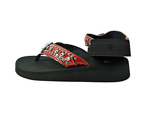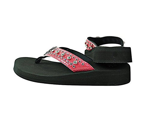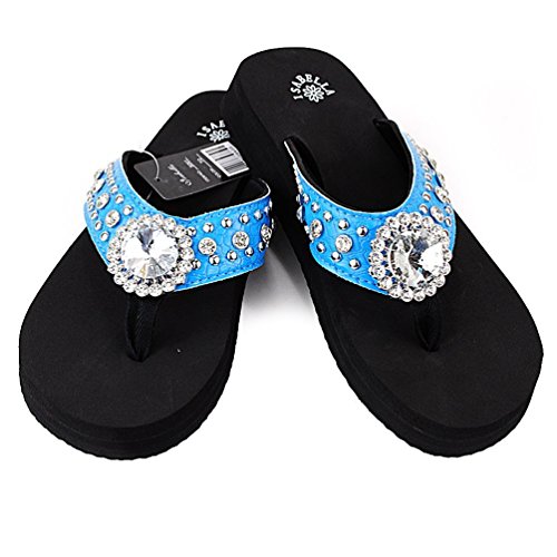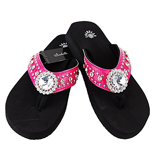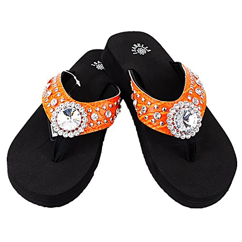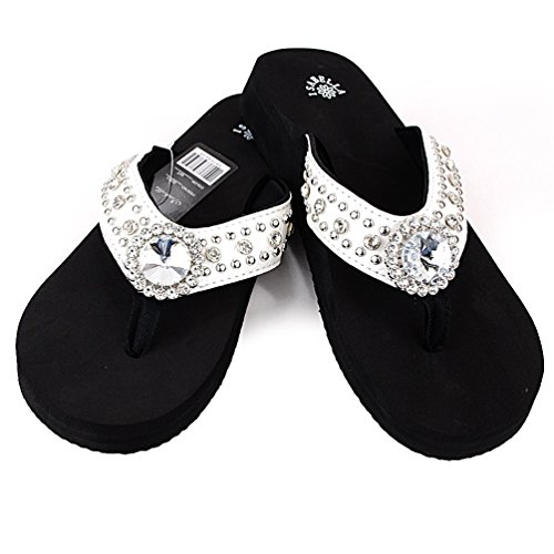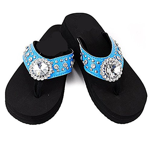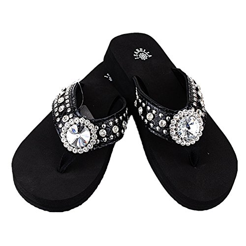 Binding : Apparel Product Description Western Rhinestone Bling Concho Flip Flops in 5 Colors. Rhineston Concho Flip flop Sandal. Sole Material: Rubber Synthetic. Size chart : small (size 6) , Medium ( size 7, 8), Large ( size 9,10), X-Large ( size 11). 3/4" thick (at the heel) thin soles that are around 1/2" (at the toe). Round open-toe thong sandals, cushiony Wedge Sole. 0