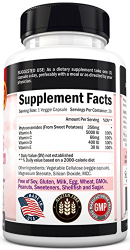 -. Feature : Phytoceramides 350mg with Vitamins A, C, D, and E / Gluten Free and derived from Sweet Potatoes