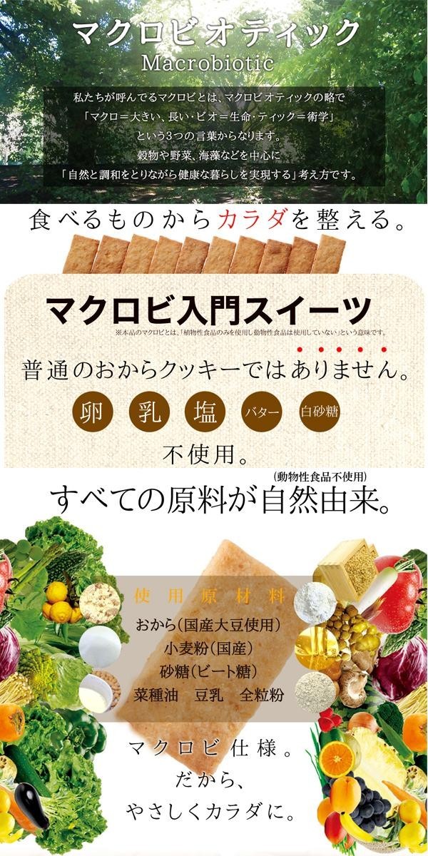| 動物性食品不使用のマクロビ仕様。すべての原料が自然由来のものでできているヘルシーなクッキーです。からだを整えるために「食」から変えてみたいと思われる方におすすめです♪ |