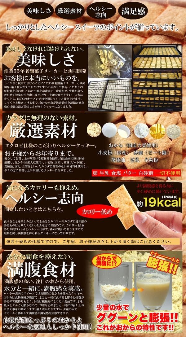 | 原材料 | おから(国産大豆使用)、小麦粉(国産)、砂糖(ビート糖)、菜種油、豆乳、全粒粉 |
