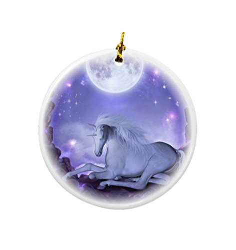 Rikki Knight White Unicorn Purple Under Moon Design Round Porcelain Two-Sided Christmas Ornaments