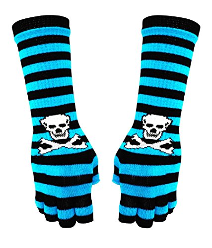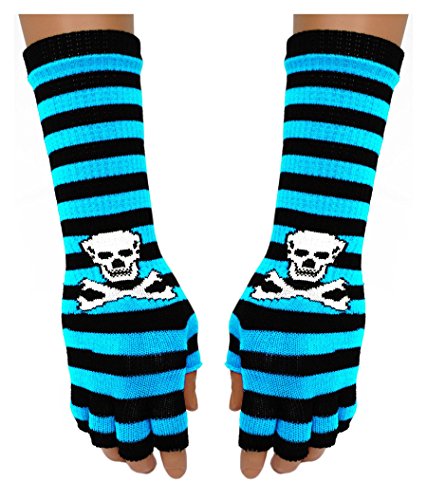 Binding : Apparel Product Description Turquoise Striped Arm Sleeves with Skull Super soft fingerless sleeves with trendy pattern Our supple arm warmers are worn pleasantly. The soft and yet stretchable materials keep the arms warm. Material: 80% Acrylic, 20% Elasthan Size: One Size (stretchy) Packed in pairs Care instructions Wash at or below 40°C, Do not dry clean, Do not bleach, Do not tumble dry, Do not iron Note: Based on various color profiles on computer monitors differences in color and pattern may occur. 0