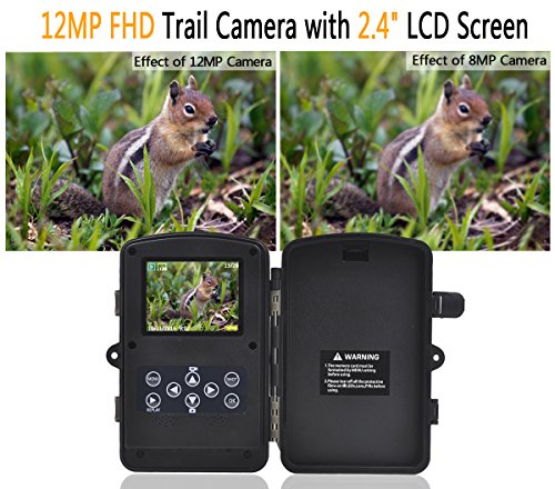 【12MP 1080P HD RESOLUTION】-Equipped with powerful 5 Megapixel CMOS sensor,this trail cam supports up to 12MP resolution in full color (black and white at night) and 1080P HD video with clear audio recording.The video length can range from 5s to 10 minutes.Adjustable resolution are available for both still images and videos.