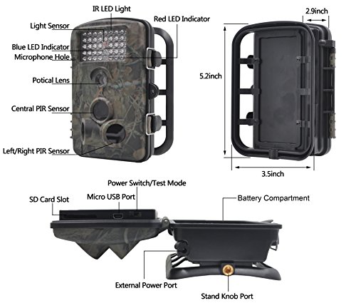 【RELIABLE and DURABLE MINI GAME CAMERA】- The XIKEZAN deer trail camera is designed to be waterproof(IP54),solid,sturdy and portable(only 5.2x3.5x2.9 inch). Powered by 4 AA batteries(not included),but it has a space for 8 AA batteries(not included).The long battery life can last up to 6 monthes(with 8 AA batteries on). You can leave this motion activated wildlife camera strapped to a tree or mounted on a wall for long period of time(stand mount and strap are included)