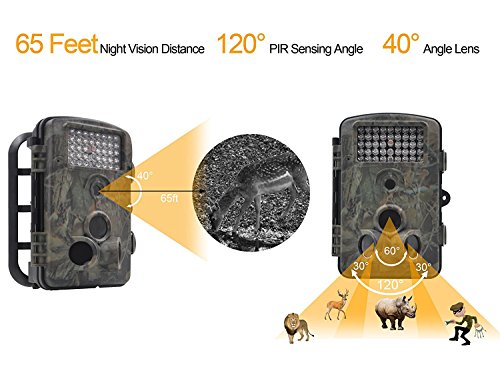 【65 FEET DETECT and FLASH RANGE】-With a 120° detection angle and a 65 feet/20m detection range,the XIKEZAN motion detection camera captures high quality images and videos.Buit-in 42pcs low glow covert infrared flash LED provides this outdoor wildlife camera with a 65 feet flash range in the dark,no movement will be missed even at night.