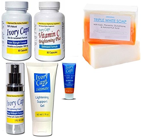 -. Feature : Includes 1 Bottle of Ivory Caps Pills, 1 Bottle of Vitamin C Brightening Plus, 1 Bottle of Skin Lightening Support Cream, 1 Bottle of Intimate Lightening Support Gel, 1 Bottle of Ivory Sun SPF 30 & Glutathione Triple White Soap / vory Caps : Preventing the oxidation (darkening) of existing skin melanin. Ivory Caps is enhanced nutritional supplement supporting skin whitening utilizing a high potency proP.R.Ietary "Skin EssentialsTM" Glutathione Complex for results. / Vitamin C :Ivory Caps Vitamin C Brightening Plus is like no other supplement because it has been specially developed to enhance the effectiveness of skin brightening by providing nutritional support though a unique blend of highly bio-available Vitamin C from several sources along with proven antioxidants, herbs and vitamins commonly used to benefit skin brightening. / Cream :Ivory Caps Mega Strength Cream for promoting skin lightening is a super concentrated cream that has been carefully developed to provide maximum benefit but is gentle to the skin and leaves skin feeling softer and more vibrant. / Ivory caps Gel : Ivory Caps Intimate Lightening Support Gel was specifically designed for lightening support of intimate and sensitive areas of the body.