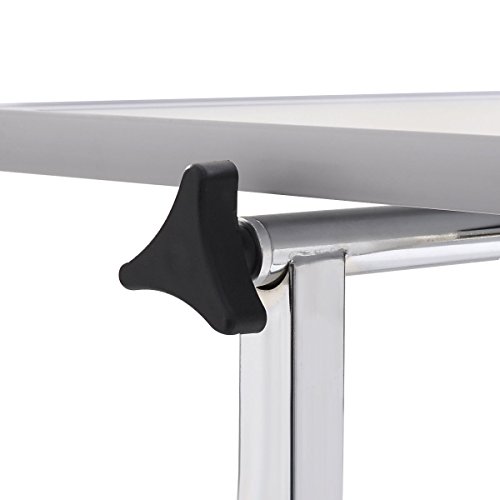 Feature Brand new and high quality Table top locked for securely Table top can be tilted to either direction until it stands vertically "H" Shape steel base for security and stability Easy maneuverability with 4 swivel casters
