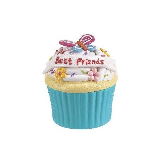 -. Feature : Design: Cute cupcake trinket box with a blue wrapper, yellow cake, white icing, sP.R.Inkles, flowers a butterfy, and a small banner with "Best Friends" message. / Size: 4.25" H x 3.5" D / Material: ceramic and resin