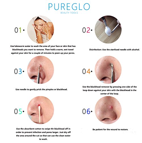 MAINTAIN HEALTHY, CLEAN SKIN - Blackheads consist of a natural skin lubricant called sebum that is a mix of skin oil, dirt, dust, and pollution stuck in your pores. With pureGLO double-ended extractor tools you can easily remove blackheads before they evolve to acne, extract pimples, blemishes, whiteheads and all other facial impurities in a safe way without any irritation and allergic reactions.