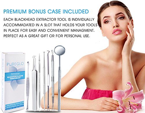7 STAINLESS STEEL INSTRUMENTS & SILICONE CLEANSING PAD - The pureGLO Blackhead Remover Tool Kit is made with antibacterial and premium 100% dermatologist grade stainless steel, including: Curved Blackhead Tweezers, Lancet Needle, Various Blackhead Sebum Scrubbers, Different Extractors - Loop and Spoon tools, Mirror and 2 Cleansing Pads. The silicone cleansing pad is equipped with tiny bristles for deep cleaning of each and every little pore of your face.