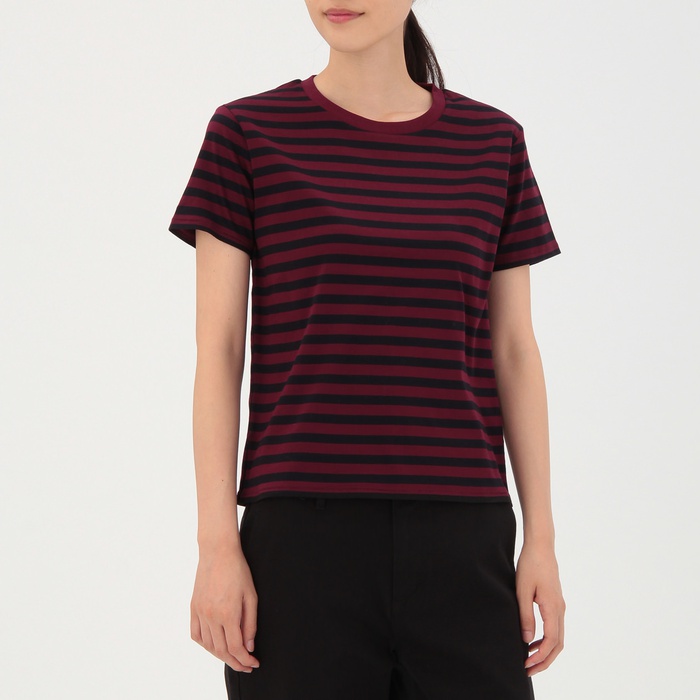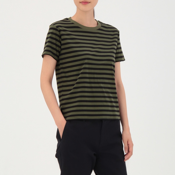 Muji 면 스무스 크루 넥 보더T셔츠 부인S카키 그린×보더SALE