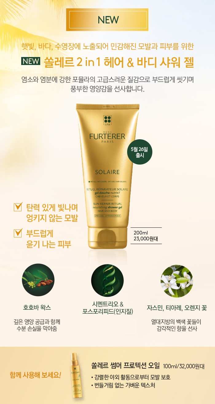 쏠레르 샤워젤(정제수, 소듐라우레스설페이트, 글리세린, 데실글루코사이드, 라우릴베타인, 아크릴레이트코폴리머, 아스코빌팔미테이트, 벤조익애씨드, 벤질살리실레이트, 시트릭애씨드, 코카마이드엠이에이, 코코-글루코사이드, 향료, 글리세릴올리에이트, 콩오일, 콩스테롤, 글라이콜디스테아레이트, 글라이코리피드, 하이드로제네이티드팜, 글리세라이드시트레이드, 하이드록시프로필구하이드록시프로필트리모늄클로라이드, 라우레스-10, 레시틴, 올레스-10, 페녹시에탄올, 포스포리피드, 살리실릭애씨드, 호호바씨오일, 소듐클로라이드