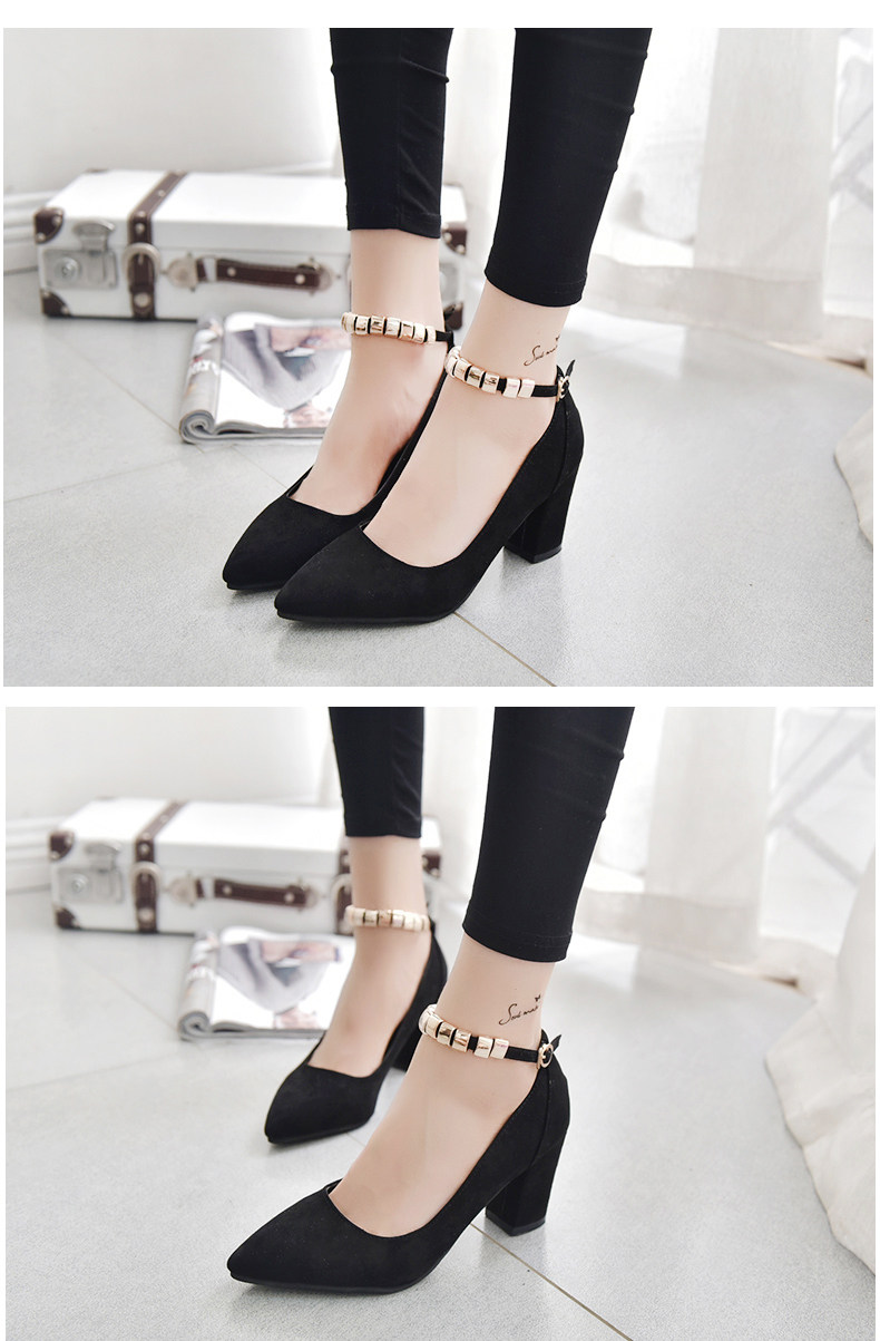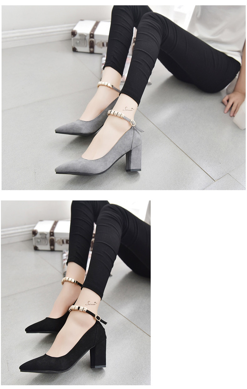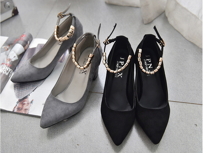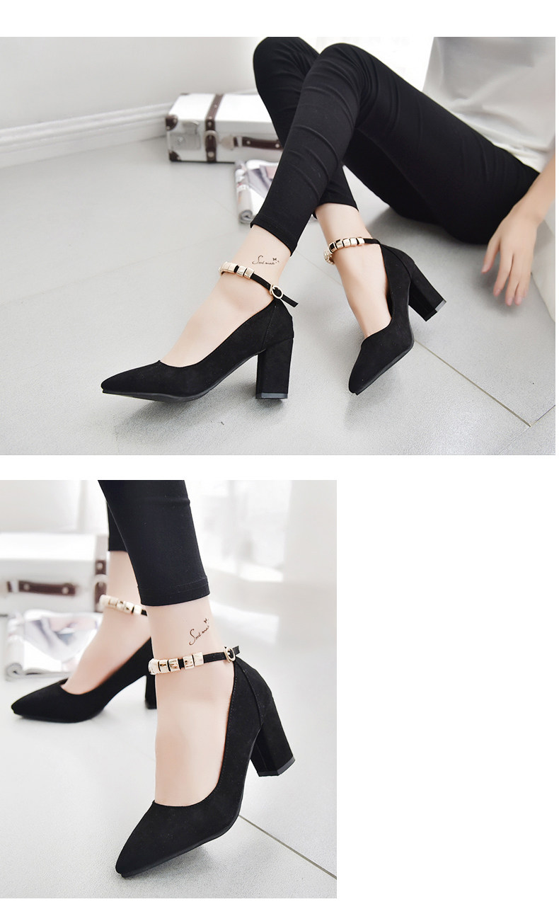 韩版一字扣带粗跟高跟鞋女秋季新款尖头小清新休闲鞋百搭女鞋
