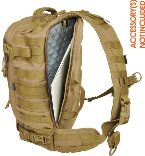 -. Feature : Unique professional sling-pack w/ generous size to accommodate laptops in its main-bay's padded retainer, yet is nimble enough to be rotated from back to chest. / Wide padded strap has MOLLE system for pouches, etc; Flat zip-pocket on front w/ velcro panel area above. / Hydration back-pocket (for bladders up to 100 Oz./ 3L); Wide-format & padded carrier fits most 15" laptops. / External Size: ~18" L x 11" W x 6.2" D (46 x 28 x 16 cm); What's Included: 1x 1" Stabilizer strap, 1x Delta retainer. / Main Material: Invista(R) 1000D Cordura(R) (500D Camo models).