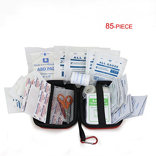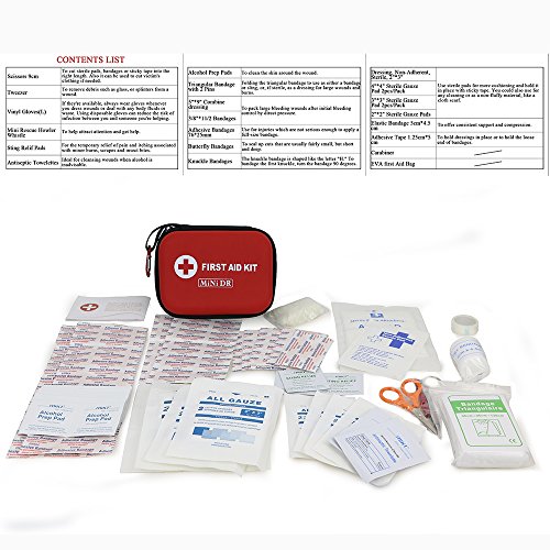 Whether you are at home, school or the office for those minor emergencies. Life is unpredictable, accidents happen and being prepared is a must in a world that changes as fast as ours. First Aid Contains 1 First Aid Guide 1 Scissors 9CM 1 Tweezer 12.5CM 1 Pair of vinyl gloves 1 Mini Rescue Howler Whistle 3 Sting relief pads 6 Antiseptic towelettes 14 Alcohol prep pads 1 Triangular bandage with 2 pins 1 5"x9" combine dressing 20 3/8"x1 1/2" bandages 10 Adhesive Bandages 3"x1" 10 Butterfly bandages 1 Knuckle bandage 2 Dressing, Non-Adherent, Sterile,2"x3" 2pcs 4"x4" sterile gauze pad(2pc/pack) 2pcs 3"x3" sterile gauze pads(2pc/pack) 4 2"x2" sterile gauze pads 1 Elastic bandage 2"x1 3/4" 1 Aclhesive Tape 1/2"x2" 1 Carabiner 1 Content card 1 EVA first aid bag 6 1/4"x4 3/4"x2 3/4"