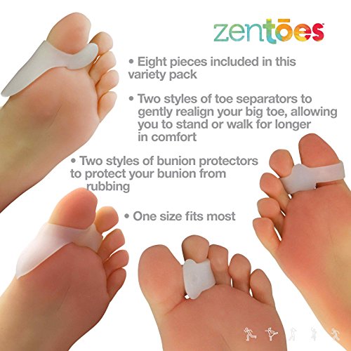 Studio : ZenToes Publisher : ZenToes Binding : Health and Beauty Product Description Ever wonder why there are so many products available for bunions treatment and bunion pain relief? The truth is that there is no single bunion treatment that provides optimal results for every person plagued by bunion pain and overlapping toes. What works for one foot may not be the best for another, which can make choosing toe separators, bunion pads and bunion corrector products difficult. ZenToes is committed to helping every person find the right bunion relief products to help them lead more comfortable lives, so we created our ZenToes Bunion Relief Variety Pack to simplify shopping for bunions treatment products. In the ZenToes Bunion Relief Variety Pack, you'll find pairs of bunion pain relief products, including bunion shield solutions, bunion toe straightener products and toe spacers. This way, you can determine which bunion relief product is right for your specific needs and choose the best bunion treatment solution to wear with all of your shoes. The variety pack includes one pair each of: - 2-in-1 Toe Protectors and Spacers with rings that fit over the big toes and second toes plus a bunion shield for protection on the side of the foot - Single toe separator rings with bunion pads that are worn on the second toes - Double ring toe separator bunion correctors that pull the big toe and the second toe away from one another - Single ring bunion shield toe spacers worn on the big toe to separate the toes, reposition the big toe and cushion the foot bunion Get the absolute best bunion pain relief solution for your feet the easy way! 0