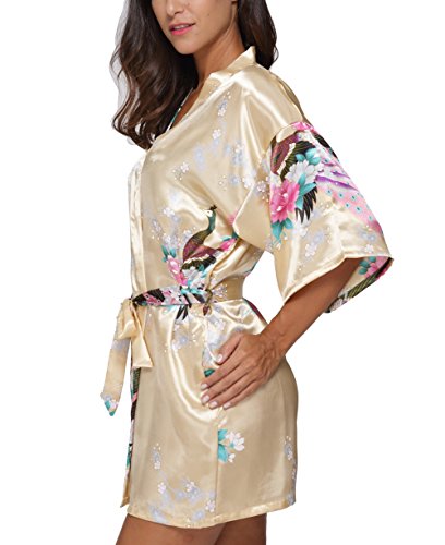 Original Kimono Women's Short Kimono Robe Bathrobe with Peacock Patterns Yellow S