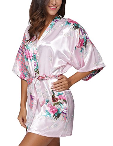 Original Kimono Women's Short Kimono Robe Bathrobe with Peacock Patterns Rose S