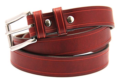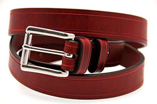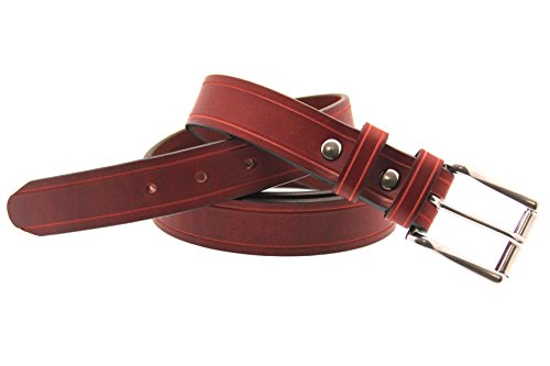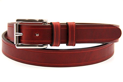 Studio : Orion Leather Publisher : Orion Leather Binding : Apparel Product Description Orion Leather men's 1 1/4 inches (32mm) wide burgundy Latigo leather belt with hand-tooled saddle groove. This leather belt is soft, supple and great when strength and flexibility are needed. The blend of oils used for this leather makes it flexible and sweat resistant. This belt has a stainless steel roller buckle, double loops, and screw posts for easy buckle changing as well as durability. Made in America with pride.