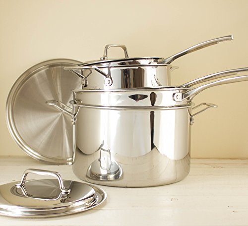 Cast stainless steel handles, stainless steel rivets and features an easy pour rim and vapor seal cover design