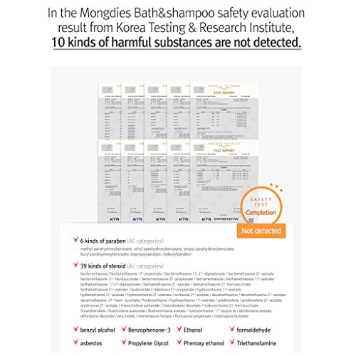 Complete harmful ingredient Zero safety test : - In the Mongdies Bath&shampoo safety evaluation result from Korea Testing & Research Institute, 10 kinds of harmful substances are not detected.