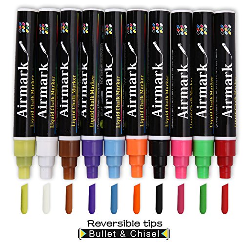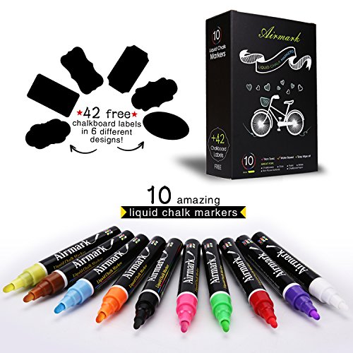 Airmark Liquid Chalk Markers Washable Pens,10 Colored Erasable with 42 Reusable Chalkboard Labels,Neon Plus Earth Colors 6mm Reversible Tip