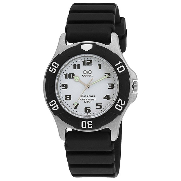 バンドカラー:ブラック、文字盤カラー:ホワイト、ケースの形状:ラウンドフェイス、表示タイプ:アナログ表示、留め金:バックル(尾錠)、回転ベゼル、ソーラー、防水:10気圧