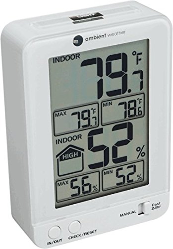 The screen displays indoor temperature, humidity, daily or manually set highs and lows, and a handy humidity icon for identitying high and low humidity conditions.