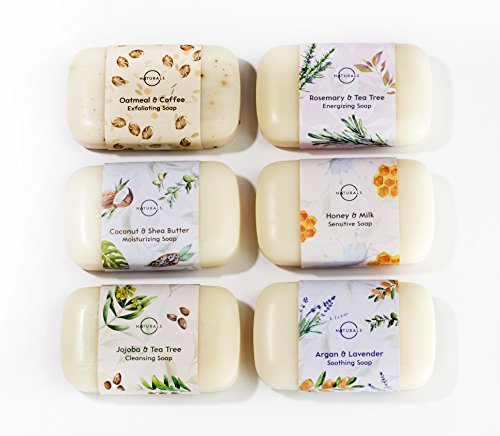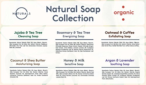 -. Feature : Our soaps have an irresistibly luxurious lather which will glide over your body and leave your skin feeling smooth and softer then ever before. / Our All Natural Soap Bars Combine - Argan & Lavender. Honey & Milk. Rosemary & Tea Tree. Oatmeal & Coffee. Jojoba & Tea Tree. Coconut & Shea Butter. / Multiple Benefits - Choose from 6 different types, Cleansing, Energizing, Exfoliating, Moisturizing, Sensitive and Soothing soaps. / Environment Friendly - All Natural Ingredients, Natural Scent, good for all skin types, No Harmful Chemicals, No Animal Testing, Eco-Friendly, Safe for Use. Made in USA. / 100% Customer Satisfaction - 100% Money-Back Guaranteed!