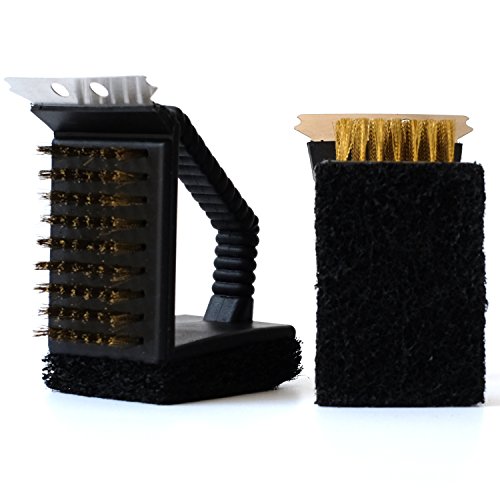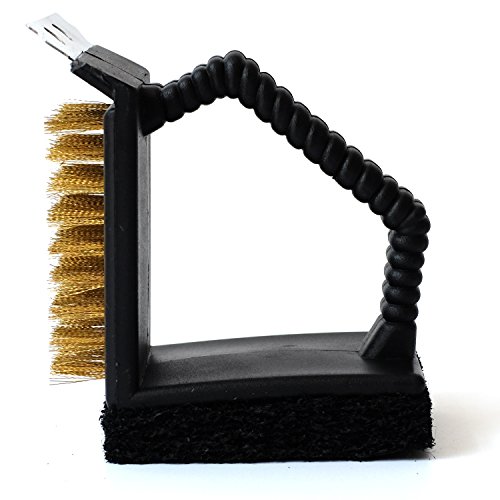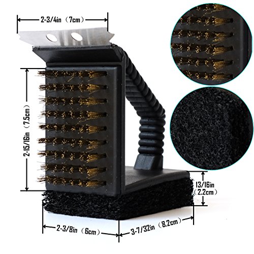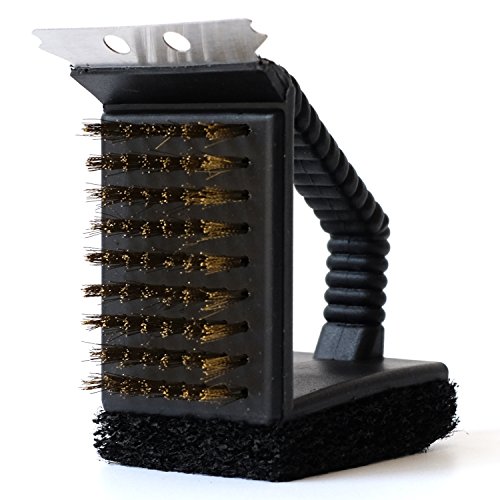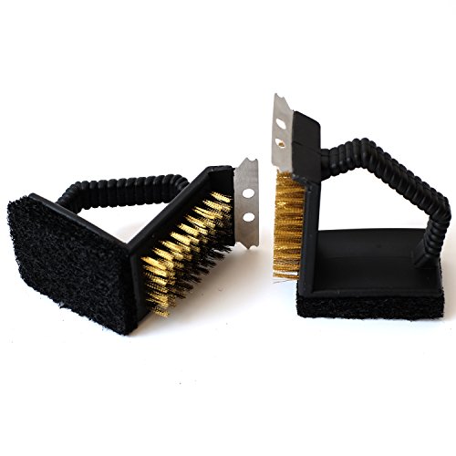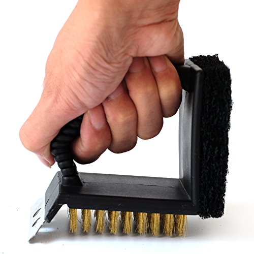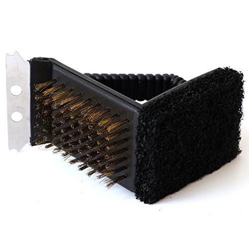 EXTRA STRONG AND DURABLE:Solid stalnless steel scraper perfectly angled to help penetrate and clear away stuck-on grime.High quality brass bristles for all surfaces including porcelain, stainless steel and cast iron.Heavy duty scouring pad for that extra cleaning experience beyond what other products can offer.