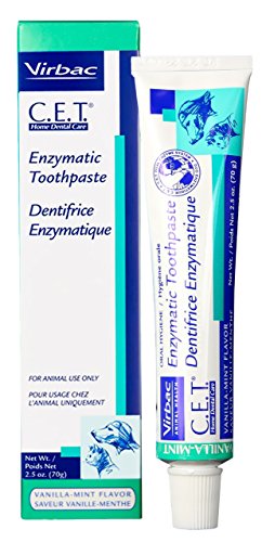 -. Binding : Misc. -. Brand : CET -. Feature : Provides the very best in Home Dental Care for your pet / Formulated to be safe, effective, and appealing to your dog or cat / Designed to reach all surfaces of your pet's teeth and the soft bristles will not irritate your pet's sensitive gums / Just a few minuets a day are all it takes for the best dental care available / Comes in five different flavors -. Label : Virbac -. LegalDisclaimer : Provides the very best in Home Dental Care for your pet Formulated to be safe, effective, and appealing to your dog or cat Designed to reach all surfaces of your pet's teeth and the soft bristles will not irritate your pet's sensitive gums Just a few minuets a day are all it takes for the best dental care available Comes in five different flavors -. Manufacturer : Virbac -. MPN : CETPASTE-4W -. PackageQuantity : 1 -. PartNumber : CETPASTE-4W -. ProductGroup : Pet Products -. ProductTypeName : PET_SUPPLIES -. Publisher : Virbac -. Studio : Virbac -. Title : CET Toothpaste Vanilla/Mint (2.5 oz.)