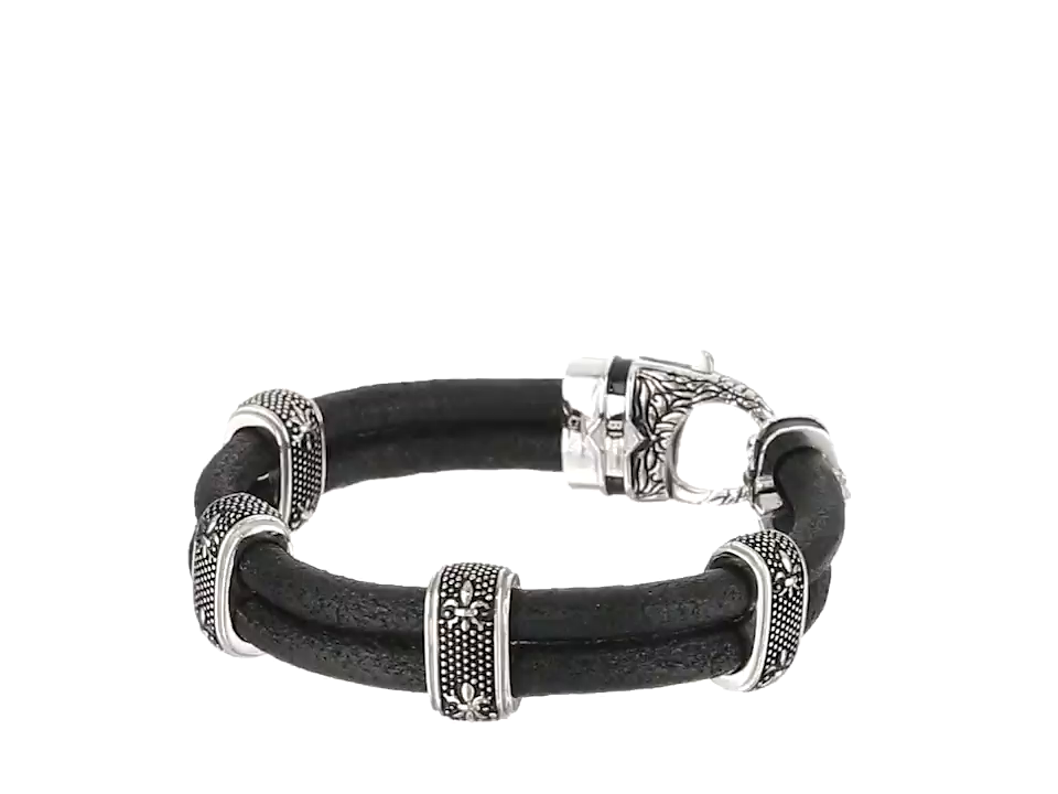 Men's Stainless Steel and Black Leather Gothic Bracelet