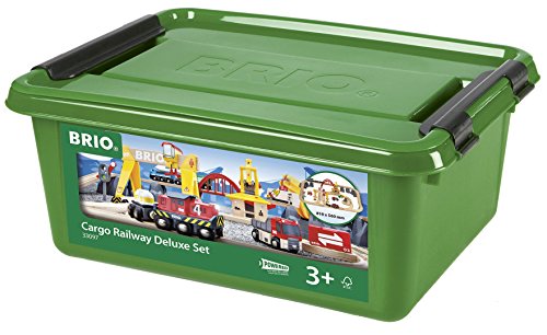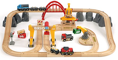 -. Feature : 54 pieces; two trains, battery powered engine, 3 cranes, truck, cargo, bridge, rocks and crossing signal make this the complete cargo train world / The battery powered freight engine pulls the heaviest loads while the light up headlight shows the way (1 AA battery not included) / Move the cargo with one of the three mechanical, magnetic cranes, each designed to get the job done, special cargo cars hold the load securely / Comes with special BRIO storage box with latching lid; works with all BRIO trains and accessories / For ages 3+