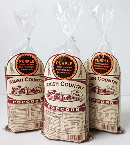 -. Feature : Pack of 3, 1-Pound Bags of Non-GMO Amish Country Popcorn / Perfect sized bags for having friends & family over to eat some AMAZING Amish-grown popcorn! / Baby White: Amish Country's smallest & most tender popcorn--a dainty delicacy! / Purple: small, nutty, tender kernels--the perfect "eatin'" popcorn & a company favorite / Ladyfinger: small, HULLESS, & oh-so-tender--truly gourmet