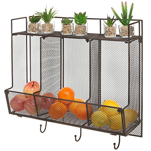 3 basket-style compartments, 3 metal hooks, and 1 top shelf for storage and display.