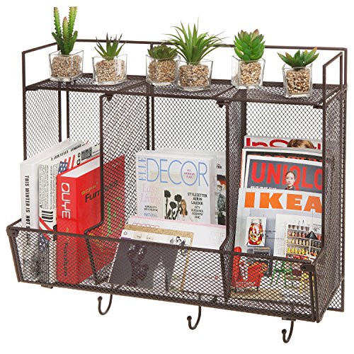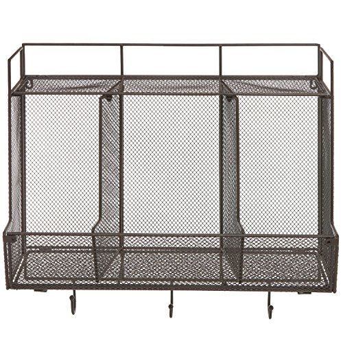 Country Rustic Large Wall Mounted Metal Wire Mesh 3 Compartment / 3 Hook Organizer Storage Rack