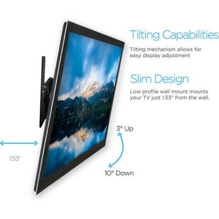 -. Binding : Electronics -. Brand : ONN -. Color : black -. EAN : 0681131134477 -. Feature : Fits 24" to 84" flat panel TVs Bonus 6' HDMI 2.0 Cable included / Solid, heavy-gauge steel construction with durable product coated finish Support up to 132 lbs / Tilt up 3 degrees and down 10 degrees Slim design mounts your TV just 1.53" from the wall / VESA Mounting Standard: 100mm x 100mm, 200mm x 100mm, 200mm x 200mm, 300mm x 300mm, 400mm x 200mm, 400mm x 400mm, 600mm x 400mm, 700mm x 400mm / Installation fast and easy Color: Black Instruction manual and mounting hardware is included UL approved -. Label : ONN -. Manufacturer : ONN -. PackageQuantity : 1 -. ProductGroup : Speakers -. ProductTypeName : AV_FURNITURE -. Publisher : ONN -. Studio : ONN -. Title : Onn Tilting TV Wall Mount Kit for 24" to 84" TVs with HDMI Cable (ONA16TM013E) -. UPC : 681131134477