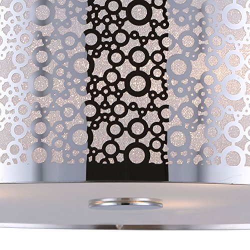Features a sleek chrome finish with a unique shade pattern that is coupled with a frosted glass panel that diffuses light evenly throughout your room