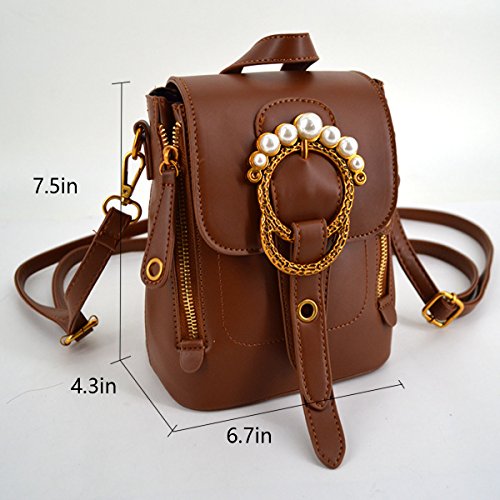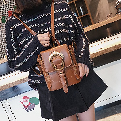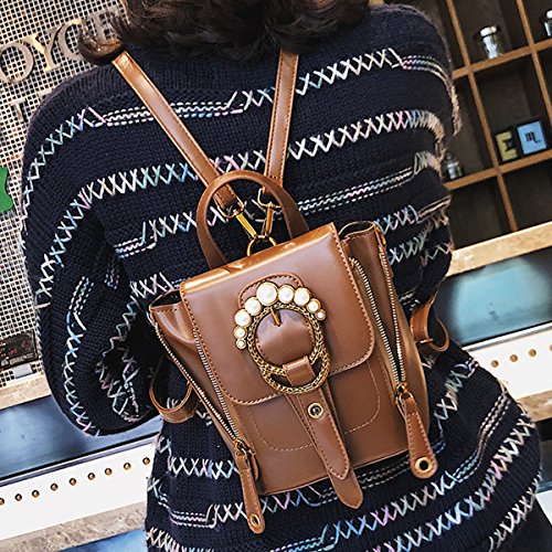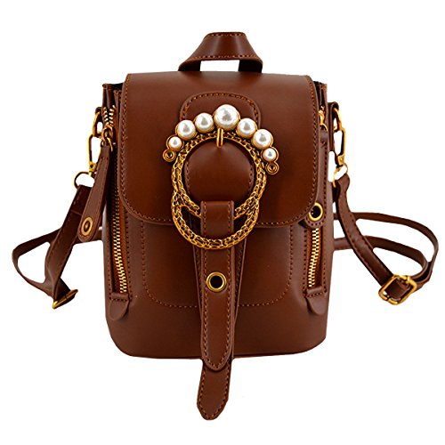 Queena Women Vintage Backpack Rhinestone Pearl Ring Shoulder Bag Tote Handbag Brown