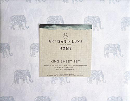 Sheet Set Gray Decorated Oriental Elephants on White King Size Deep Pockets Artisan NY Bedding 100% Cotton -- Rangoon Elephant