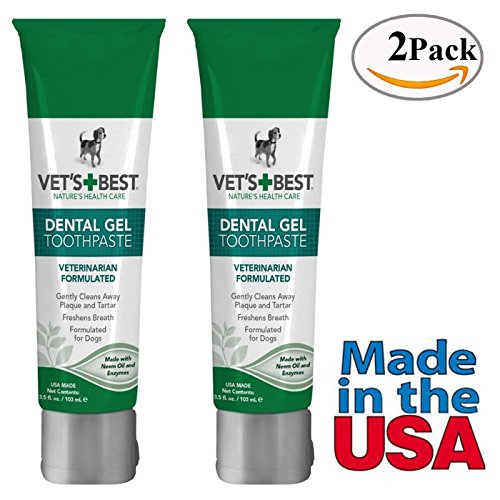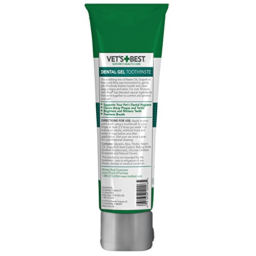 Vet's Best Dog Dental Care Gel is the natural way to better oral care. Vet's Best Dental Care Gel for Dogs fights tartar and plaque to help support healthy gums, teeth, and freshen your dog's breath and helps to whiten and brighten your dog's smile at the same time. Dental Care Gel Toothpaste for Dogs uses key natural ingredients (neem oil, grapefruit seed extract, aloe, and enzymes) that provide anti-bacterial and anti-fungal qualities to fight bad dog breath and clean teeth. Simple application: use a brush or your finger to apply to dog's teeth 2 - 3 times a week. This product is not intended for the treatment or cure of any illness, disease or medical condition. Apply with a brush, or rub with your finger on your pet's teeth 2-3 times per week For best results, no food or water 30 minutes before and after application - this item does NOT have an expiration date. The date on the product is the born-on date. Visit your vet once a year for a professional cleaning. Each Package Contains 2 Vet's Best Dog Dental Care Gel Toothpaste Each 3.5 Oz. Pictures may be magnified to show detail. For further information on size, color, conditions please refer to the item description or please ask a question before buying.Feature