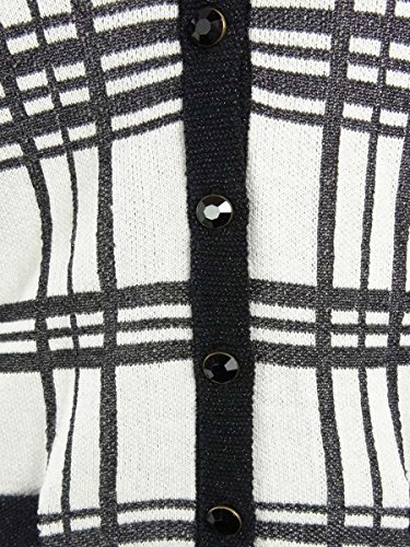 This feminine knit cardigan from Jones New York features long sleeves, plaid design, metallic threading, seven button closure, and knit finish.