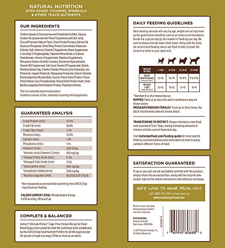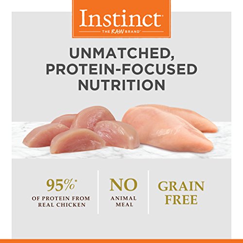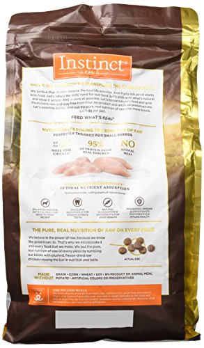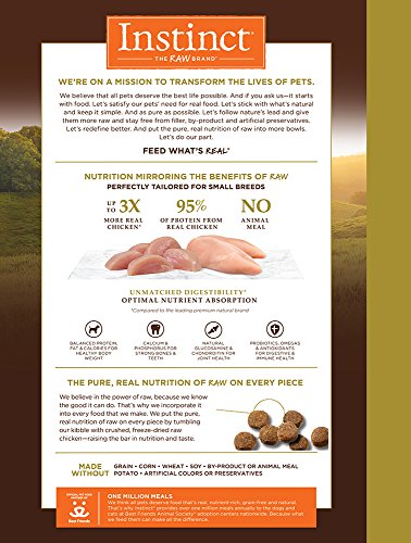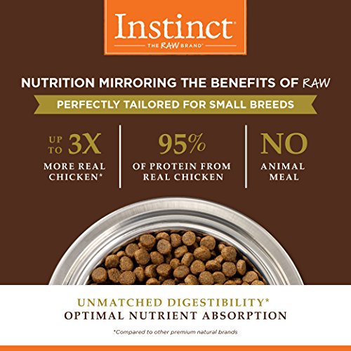 Based on our belief that raw is the purest form of nutrition, we challenged ourselves to craft a kibble that most closely mirrors the benefits of our raw diets and is perfectly tailored for your small breed dog - a kibble with the highest levels of protein from real meat and unmatched digestibility* for optimal nutrient absorption. The result, Instinct Ultimate Protein Grain-Free Cage-Free Chicken Recipe for Small Breed dogs. (*compared to other premium natural dog food brands)