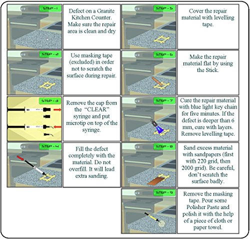 -. Feature : Advanced Light Cure Technology / Fast and permanent repairs on Natural and engineered stones like Granite, Marble, Travertine, Limestone, Slate, Sandstone, Quartzite. / Defects like chips, nicks, pits, deep scratches and surface defects / Can be used safely on Food Preparation surfaces. Non-toxic material. / It cures with visible blue light in minutes and all repair process takes less than 10 minutes. The kit has enough material and accessorries to make 3 average size repairs.