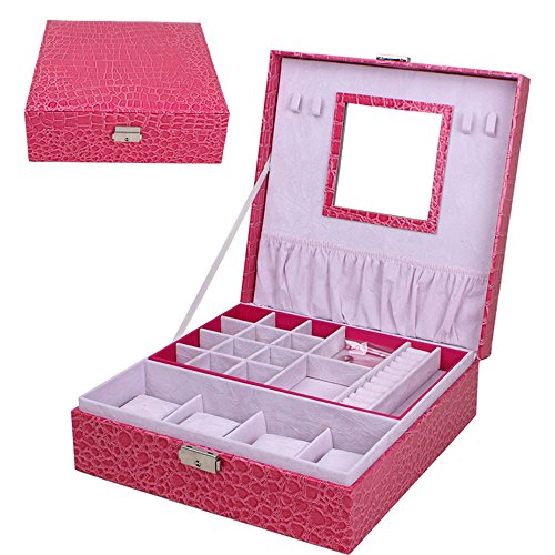 -. Feature : EXCELLENT QUALITY - Made of quality faux leather and soft beige velvet, this jewelry box is approP.R.Iate to protect your beloved jewelry from scratch and damage / TIDY STORAGE - 1 mirror, 1 ring cases, 4 Watch slots with removal velvet pillows, 15 more compartment for cufflinks, earrings, brooches necklaces, bracelets, and other jewelry / HANDLE, MIRROR & SNAP CLOSURE - Handle and mirror provided, snap closure with keys makes sure of safety / SLAP-UP TEXTURE - First-rate textured exterior, pleasant to touch, thickened MDF structure, sturdy and tough, black leather interior, soft and silky / Approximate Dimensions : 26.2cm(L)*26.2cm(W)*8.6cm(H) / 10.32"(L)*10.32"(W)*3.39"(H)