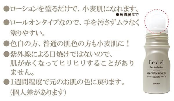 | 塗るだけ簡単、ムラなく小麦肌になれるタンニングローションです(角質層までの着色効果)。ロールオンタイプなので、手を汚さずムラなく塗りやすい♪紫外線による日焼けではないので、肌が赤くなってヒリヒリすることがありません。1週間程度で元のお肌の色に戻ります(個人差があります)。 |